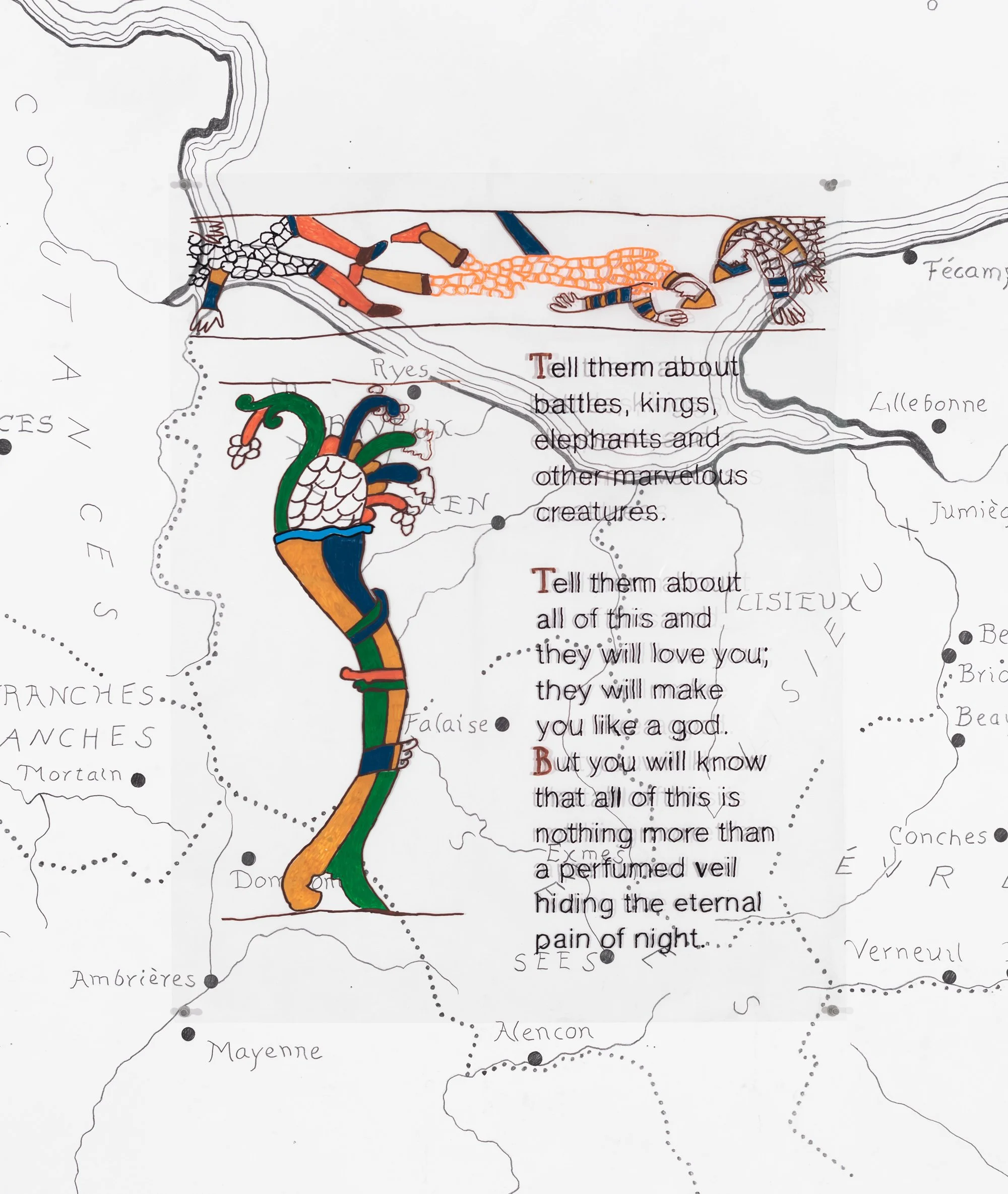 Mathias Enard, marker on acetate and paper, 24” x 19”, 2026